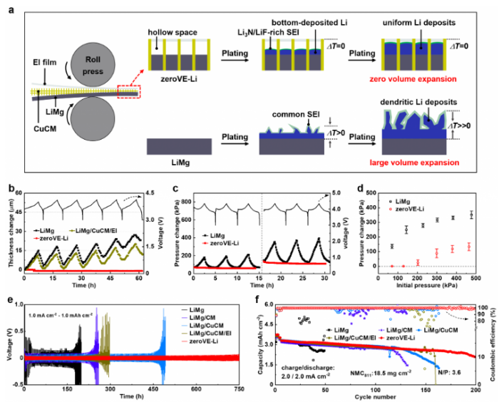 圖1.(a)零體積膨脹設計鋰復合負極的輥壓制備與運行機理示意圖。(b)zeroVE-Li,LiMg/CuCM/EI和LiMg負極在鋰沉積/剝離過程中的厚度變化行為。(c)特定外壓(70和140 kPa)下基于zeroVE-Li和LiMg的鋰金屬電池的膨脹力變化與充放電變化關系。(d)不同固定外壓與基于zeroVE-Li和LiMg的鋰金屬電池的最大膨脹力關系。(e)不同鋰負極的對稱電池循環穩定性圖。(f)基于不同鋰負極的扣式全電池循環性能圖。