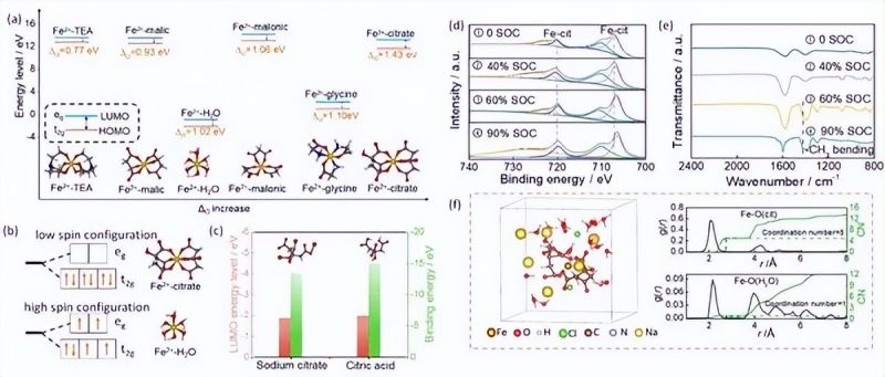 圖1(a-c)配體量子化學計算篩選;(d-e)XPS與FTIR分析;(f)Fe2+-citrate絡合物溶劑化結構DFT-MD計算