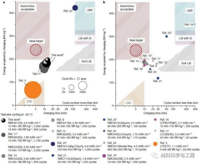 圖1.快充電池的優(yōu)勢(shì)圖。綜述了有關(guān)充電比能量隨充電時(shí)間變化的文獻(xiàn)研究,在給定的充電條件下,以氣泡大小表示循環(huán)壽命。a,循環(huán)數(shù)大于800的電池。b,循環(huán)數(shù)小于800的電池。