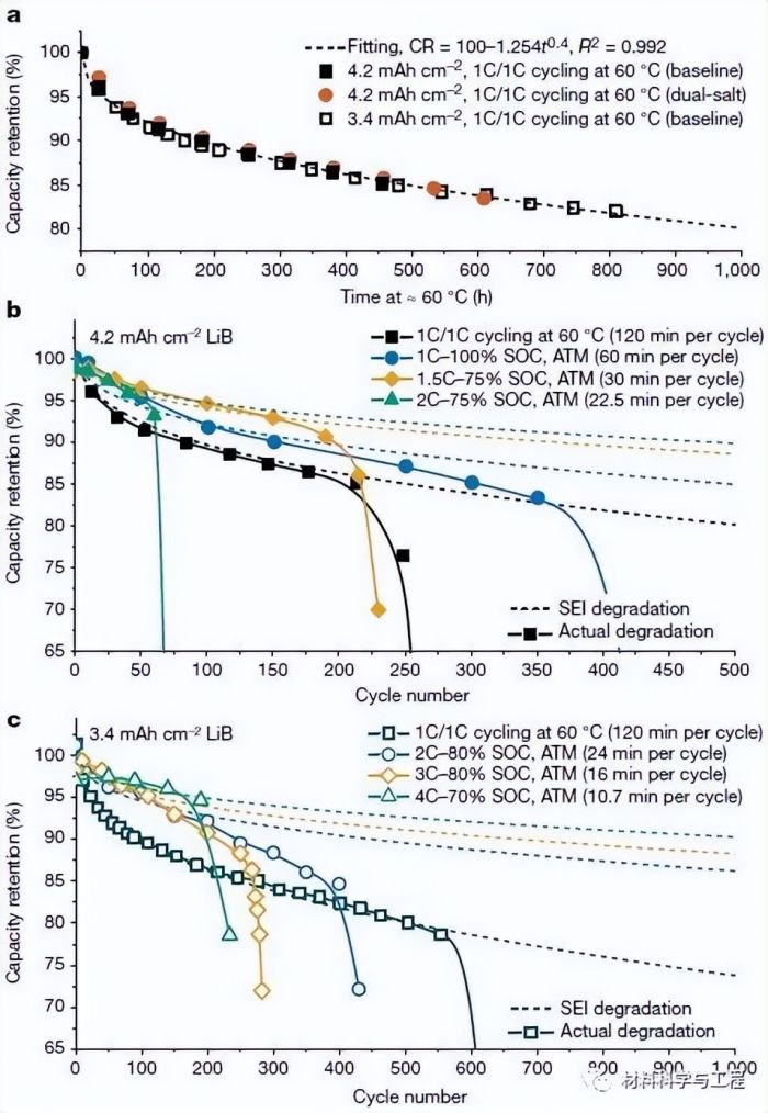 圖2.高能鋰離子電池的ATM循環(huán)。a,在60°C恒定1C/1C循環(huán)來(lái)表征SEI降解。b,4.2 mAh cm?2電池的ATM快充。c,3.4 mAh cm?2電池的ATM快充。b和c中的實(shí)線(xiàn)表示實(shí)際的電池容量損失,而虛線(xiàn)表示SEI造成的容量損失。
