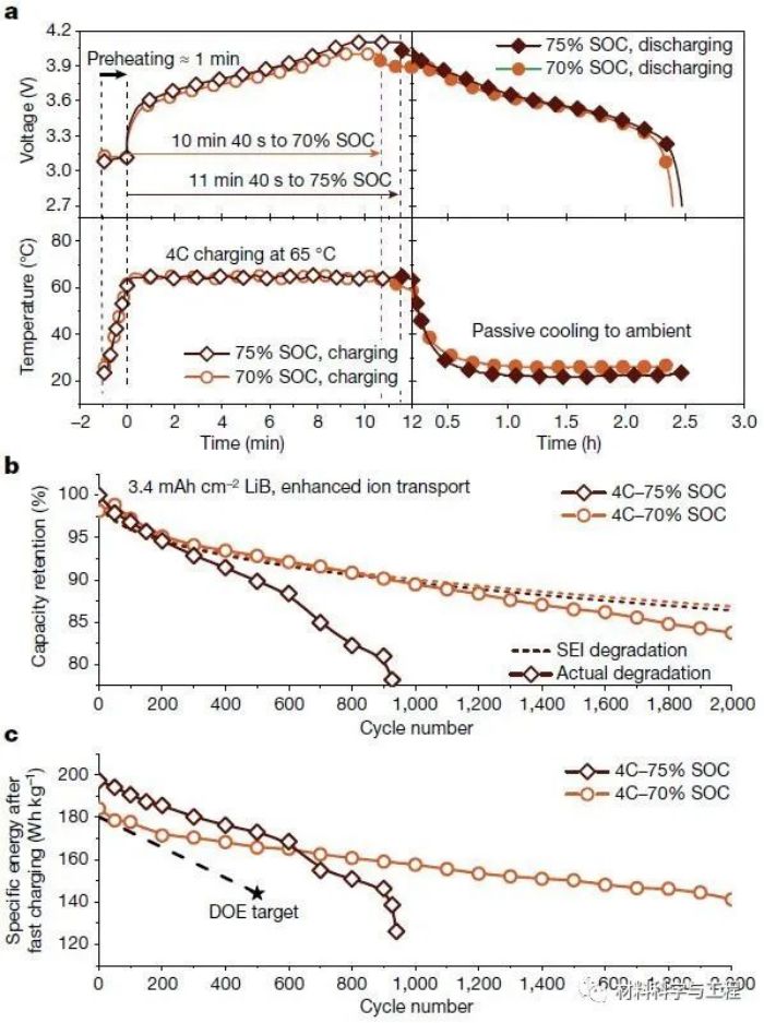 圖3.離子傳遞增強(qiáng)下的高能鋰離子電池的快速充電。a,ATM循環(huán)下的電壓和溫度分布。b,快速充電下的容量保持率。c,快速充電后獲得的比能量。