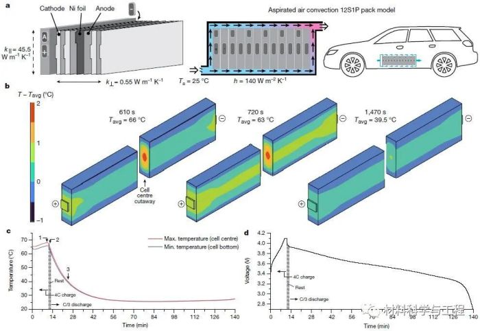 圖4.150Ah棱鏡電池12S1P包的電化學(xué)-熱耦合模擬。a,電池結(jié)構(gòu)、組件模型和吸氣空氣對(duì)流下的熱條件。b,在4C充電-C/3放電循環(huán)過(guò)程中,150 Ah棱柱電池在三個(gè)代表性時(shí)間的瞬間三維溫差輪廓。c,棱柱電池內(nèi)最高和最低溫度的演化。d,循環(huán)過(guò)程中電池電壓的變化。